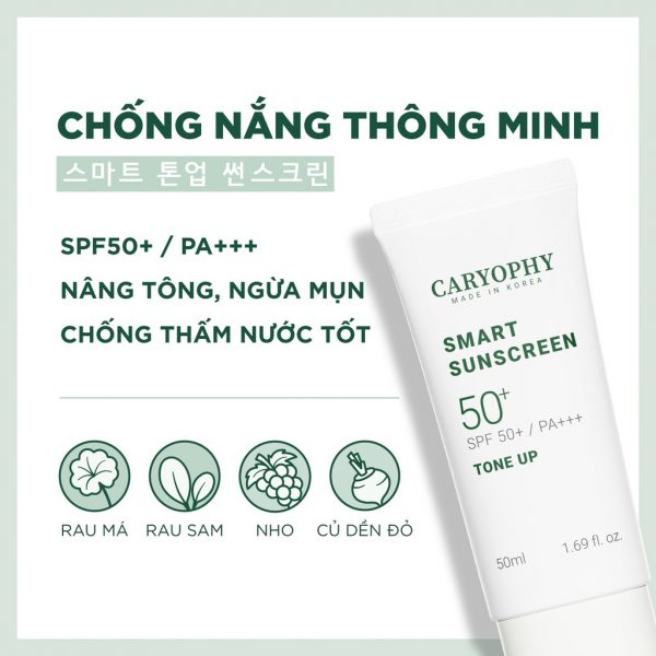 Kem chống nắng thông minh Caryophy Smart Sunscreen Tone Up là dòng kem chống nắng vật lý SPF 50+/PA+++ bảo vệ da khỏi tia UV bằng cách tạo lớp chắn trên bề mặt da rồi khuếch tán và phản xạ lại tia UV ngăn không cho chúng xuyên thấu vào da. Chống thấm nước cao, nâng tone nhẹ da và hỗ trợ ngăn ngừa trị mụn giảm thâm hiệu quả.